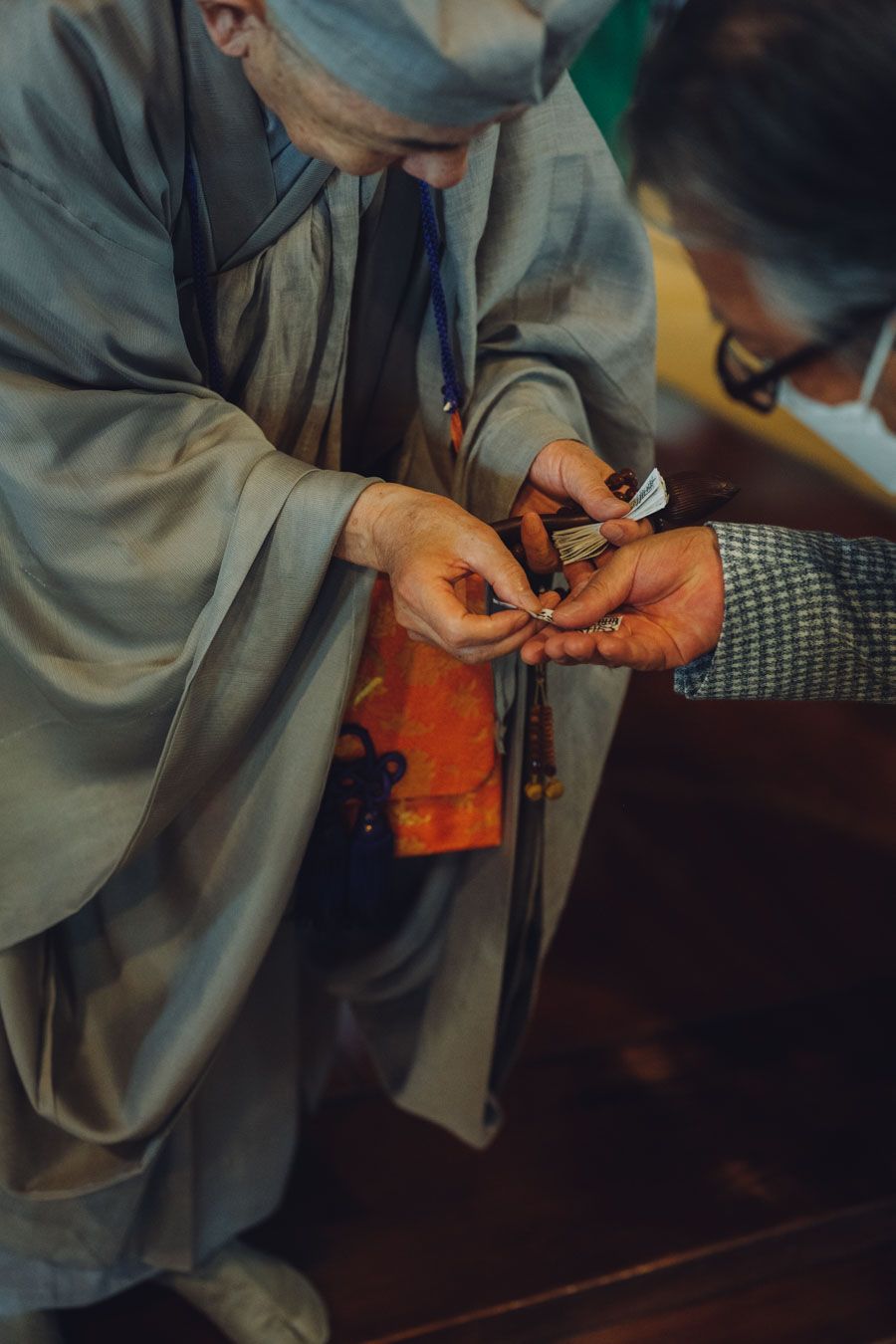 御賦算とはわかりやすく言えば、「お札くばり」のことです。賦は「くばる」、算は「念仏札」を意味します。 遊行上人が巡り歩かれるところで、必ず御賦算を行います。 念仏札は、集まった人々1人ずつに遊行上人が手ずから配られます。 一遍上人は、生涯に約250万1千人(25万1千人とも)に配られたと記録されています。 お念仏を称えれば、阿弥陀仏の本願の舟に乗じて極楽浄土に往生できるとの安心のお札であります。「南無阿弥陀佛決定往生六十万人」と刷り込まれていますが、「決定往生六十万人」とは、60万人の人々にお札を配ることを願われ、また次の60万人の人たちに、ついには総ての人々(一切衆生)に配ることを、念願されたのであります。